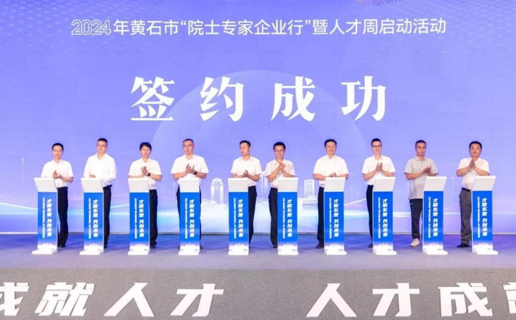 7月23日,由中共黄石市委人才工作领导小组组织主办的“才聚东楚 共创未来”2024年黄石市“院士专家企业行”活动,在黄石市闻泰花园酒店举行。市委书记郄英才出席活动并致欢迎辞,省委组织部副部长、省委编办主任王炜出席活动并致辞。来自高校和科研院所的专家教授和企业的代表齐聚一堂,气氛活跃,针对黄石市重点产业链的高端人才需求和技术攻关项目,高校专家教授与各行各业的企业进行了对接活动,并在现场举行了签约仪式,签订院士团队合作项目2个,人才合作项目10个,人才服务合作项目4个。