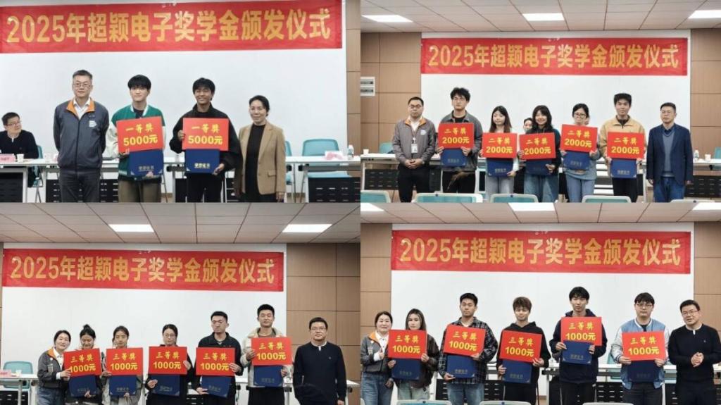 学院党总支部副书记闵建华宣读了2025年超颖电子奖学金的获奖名单。他对同学们提出了2点希望:希望获奖同学们发挥模范表率作用,希望全院同学向获奖学生学习,努力做到全面发展。随后,学院领导、颁奖嘉宾分别给获奖学生代表颁发证书、合影留念。