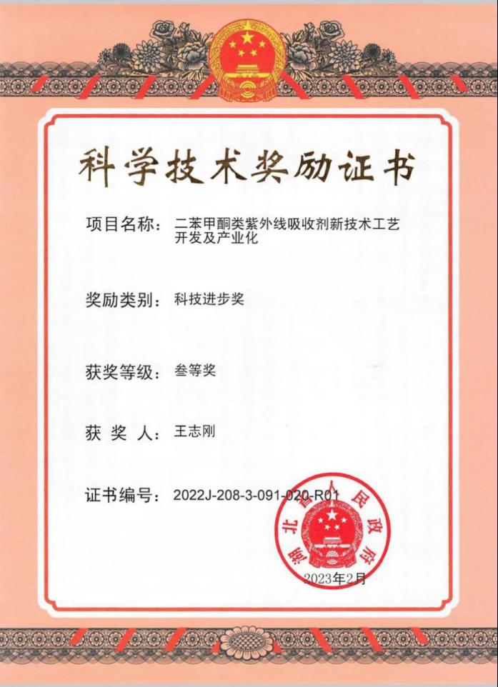 2、2023年2月获得湖北省科技进步三等奖,项目名称:《二苯甲酮类紫外线吸收剂新技术工艺开发及产业化》,排名第一。