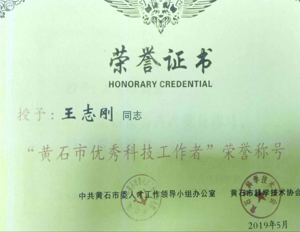 10、2019年5月获得中共黄石市委人才工作领导小组办公室、黄石市科学技术协会授予“黄石市优秀科技工作者”荣誉称号