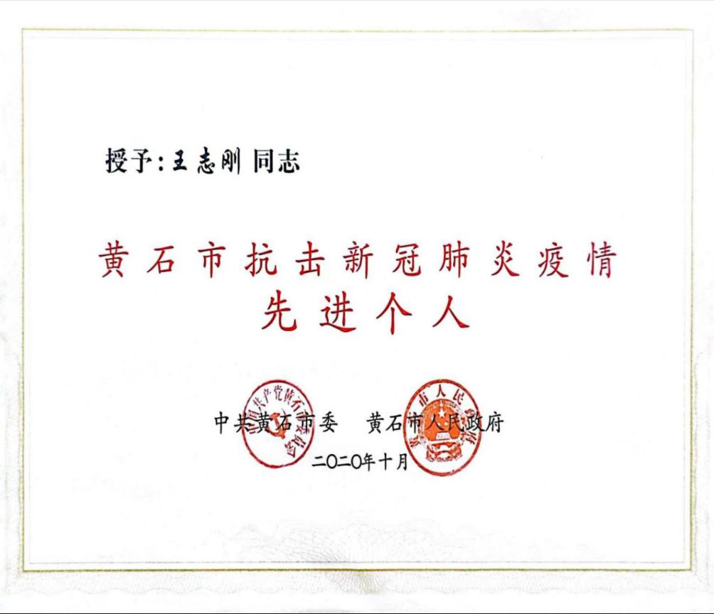8、2020年10月获得“黄石市抗击新冠肺炎疫情先进个人”