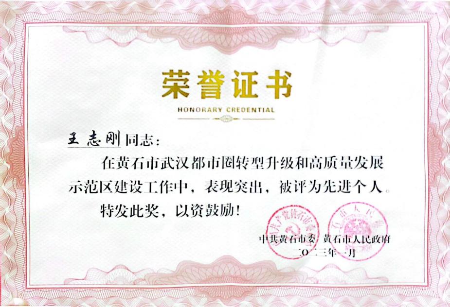 4、2023年1月获得“黄石市武汉都市圈转型升级和高质量发展示范区建设工作先进个人”荣誉称号
