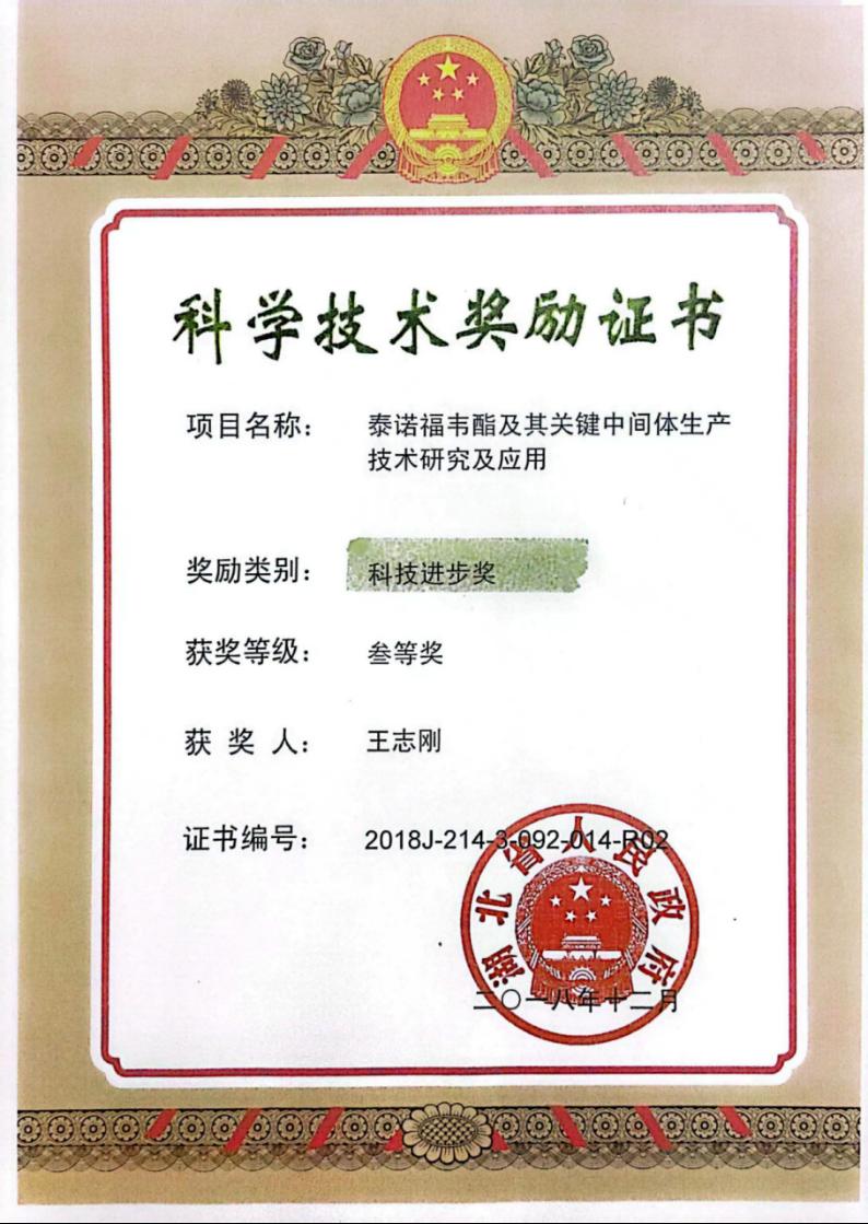 1、2019年4月获得湖北省科技进步三等奖,项目名称:《泰诺福韦酯及其关键中间体升级技术研究及应用》,排名第二。